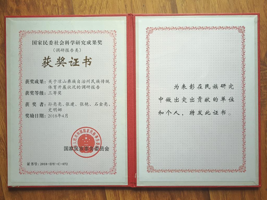 近日,国家民委2017年度全国民族工作优秀调研报告评选结果揭晓。taptap孙亮亮副教授带领研究团队完成的《关于凉山彝族自治州民族传统体育开展状况的调研报告》,荣获国家民委社会科学研究成果奖(调研报告类)三等奖。