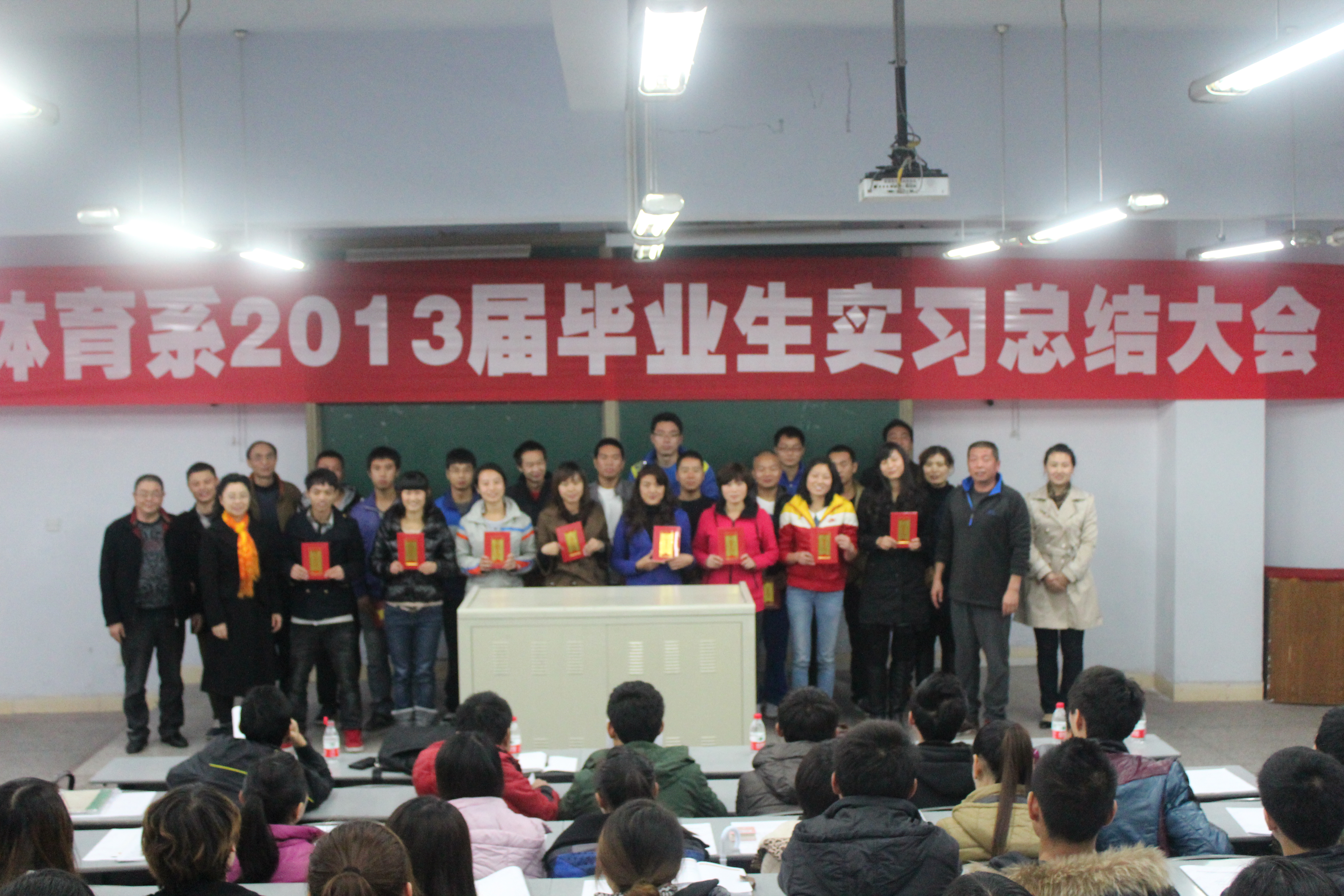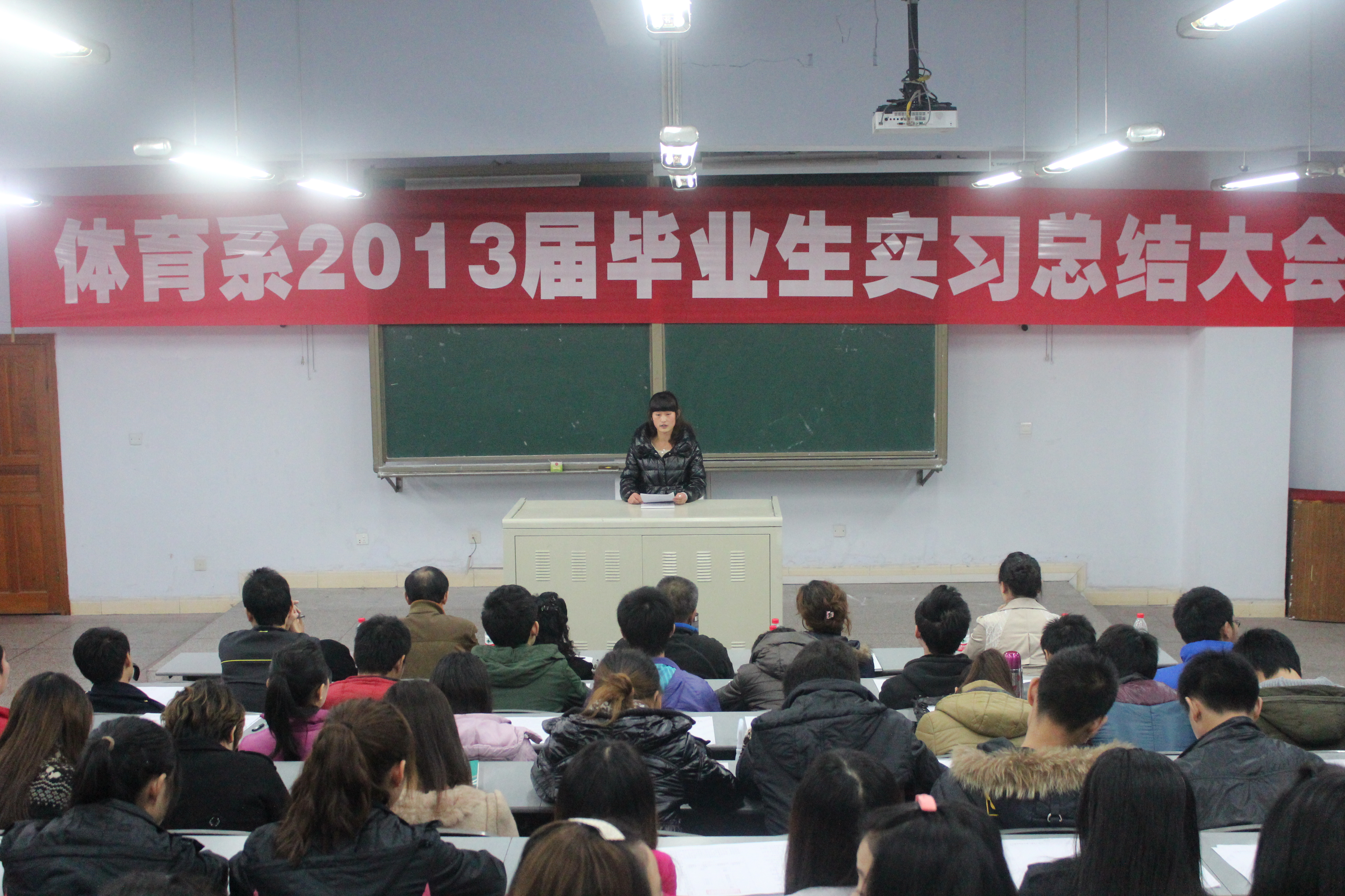 2012年11月15日下午4:30,四川文理学院体育系2013届毕业生在莲湖校区教学楼125教室举行实习总结大会。此次大会由何其波同学主持,参加此次大会的有教务处曹科长、体育系主任董立教授、体育系副主任陈碧述教授、体育系李文华老师、体育系团总支书记兼辅导员李霞老师、体育系辅导员那明明老师,以及体育系2013届的全体毕业生。
