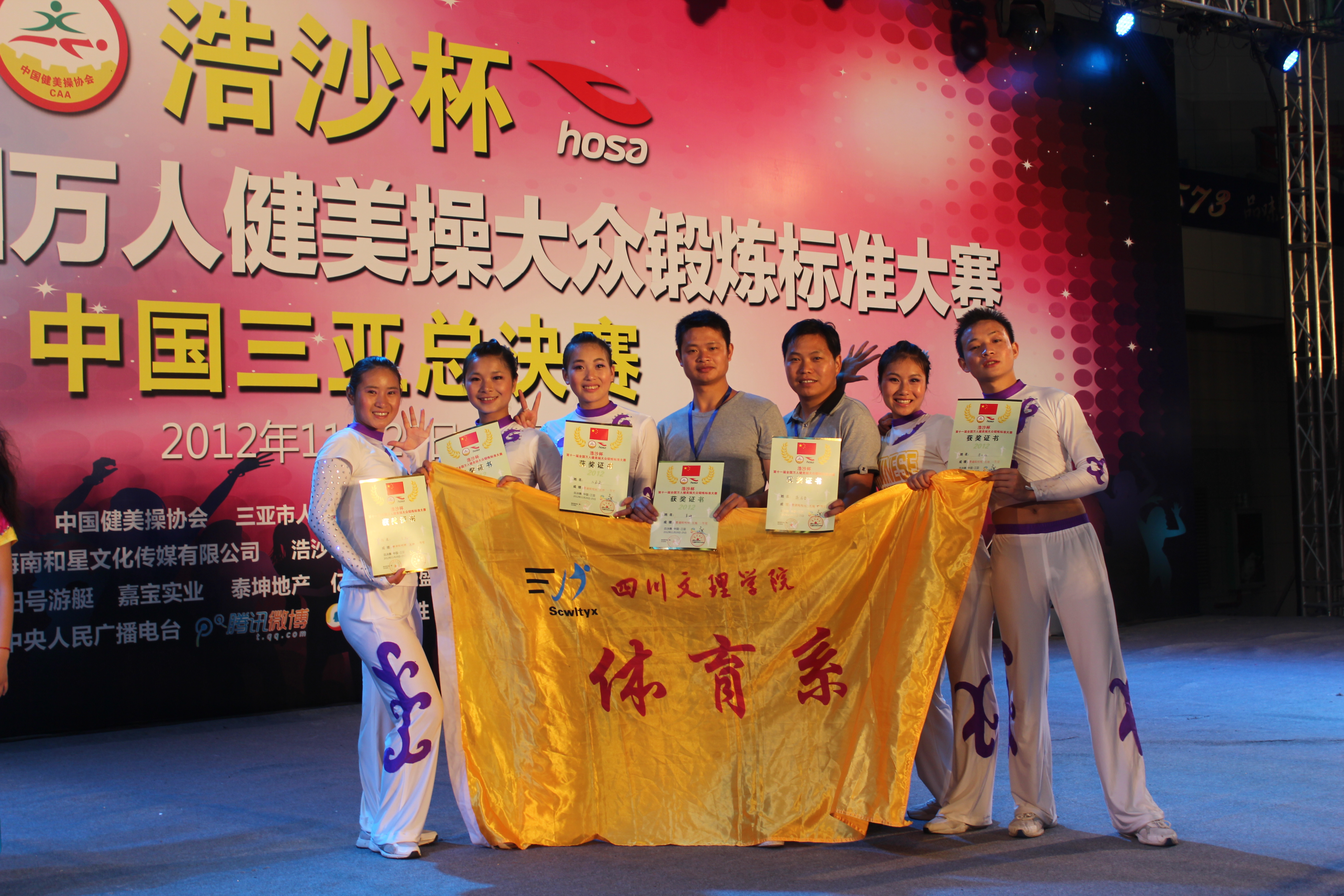 1121至24日,由国家体育总局体操运动管理中心、中国健美操协会主办,浩沙(中国)有限公司、浩沙国际健身管理有限公司承办的2012年“浩沙杯”全国万人健美操大赛总决赛在中国三亚隆重举行,全国来自北京、福建、广东、江西、海南等18个省市约50多支队伍共1000余人参加了此次比赛,taptap体育系组建的大众五级队在体育系党总支副书记张皓老师及冉卫东教练的带领下参加了本次比赛,并获得了喜人的成绩。