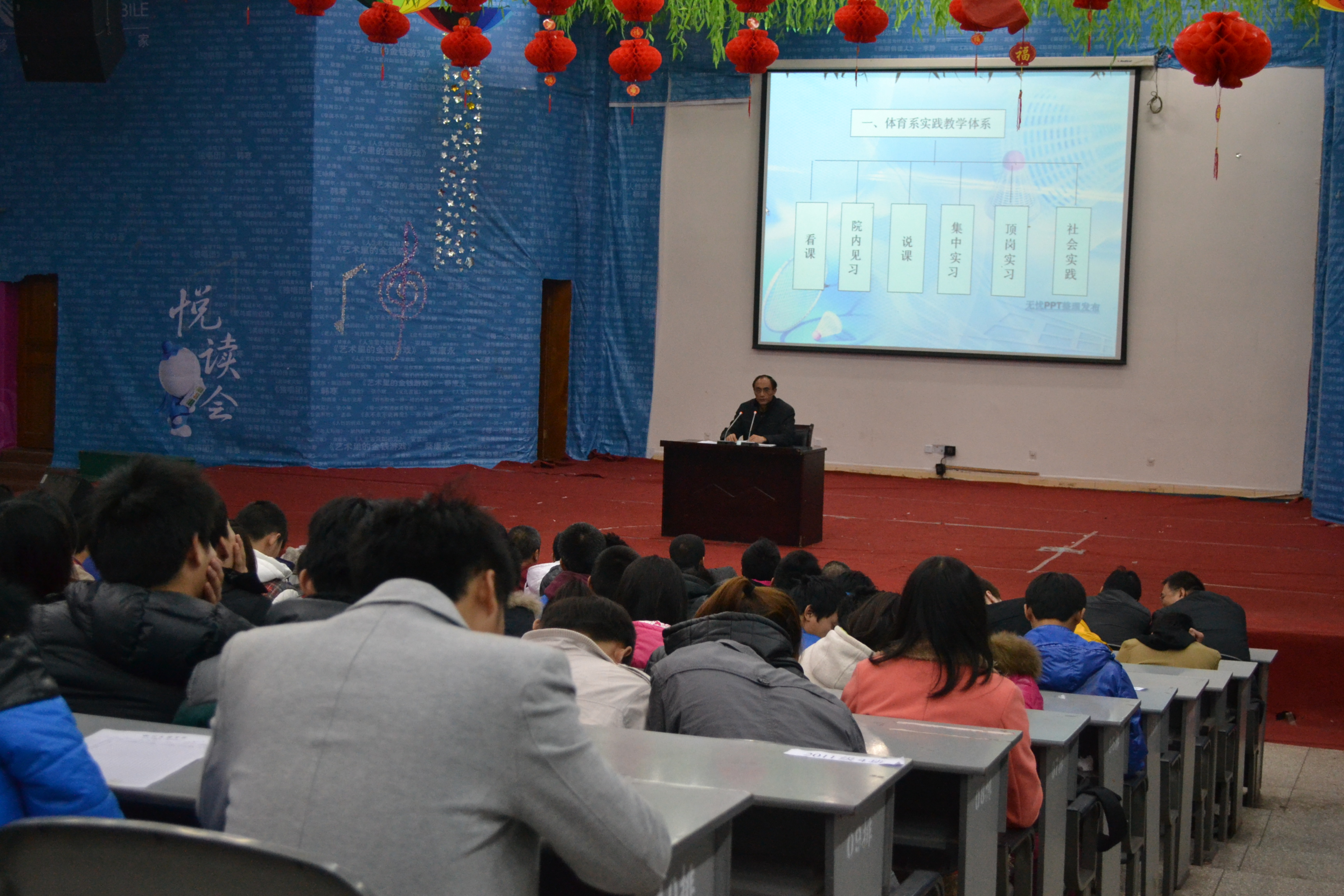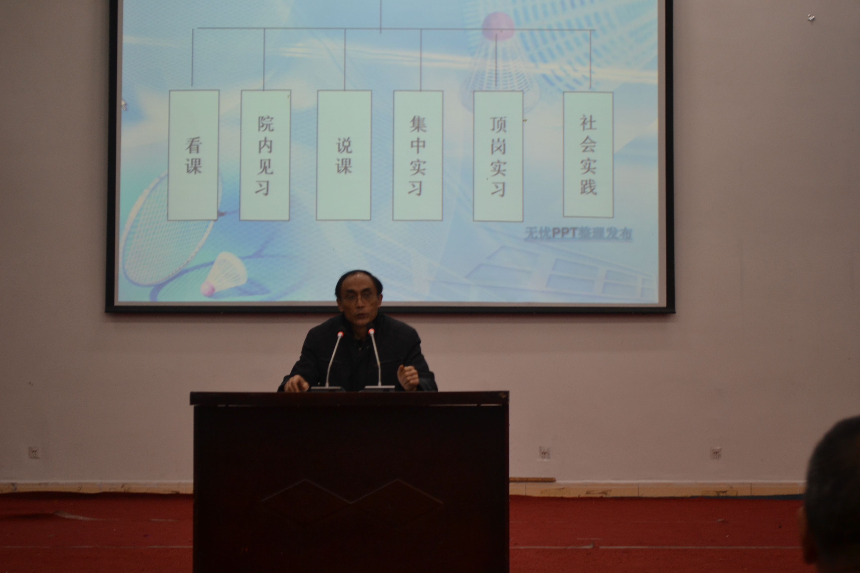 2012年12月10日晚7点,陈碧述教授在四川文理学院莲湖校区126教室作题为“抓好实践教学 夯实就业基础”的学术讲座。本次讲座由体育系主任董立教授主持,体育系部分教师及300余名学生到场聆听。