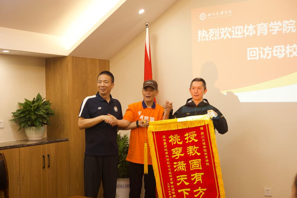 参观结束后,在体育馆117会议室召开了1977级师生座谈会,校友办负责人及学院党政领导出席。学院党委书记王兆忠代表学院表达了对学院教师前辈和校友们热诚的欢迎。校友代表向学院赠送了锦旗,“授教固有方,桃李满天下”表达了校友们对学院的感恩、肯定和期望。院长佘涛介绍了学院发展历程、现状和规划,并期待前辈及校友们对学院的发展指点迷津。接下来,进行了交流发言。大家纷纷表示,毕业四十多年重回母校,亲眼见证了学校翻天覆地的变化,为学校的办学成就感到欣慰。在交流过程中,饱含感慨、感动和感恩。前辈邓朝胜等三位老师还就学院的特色发展、创新发展提出了宝贵的建议。