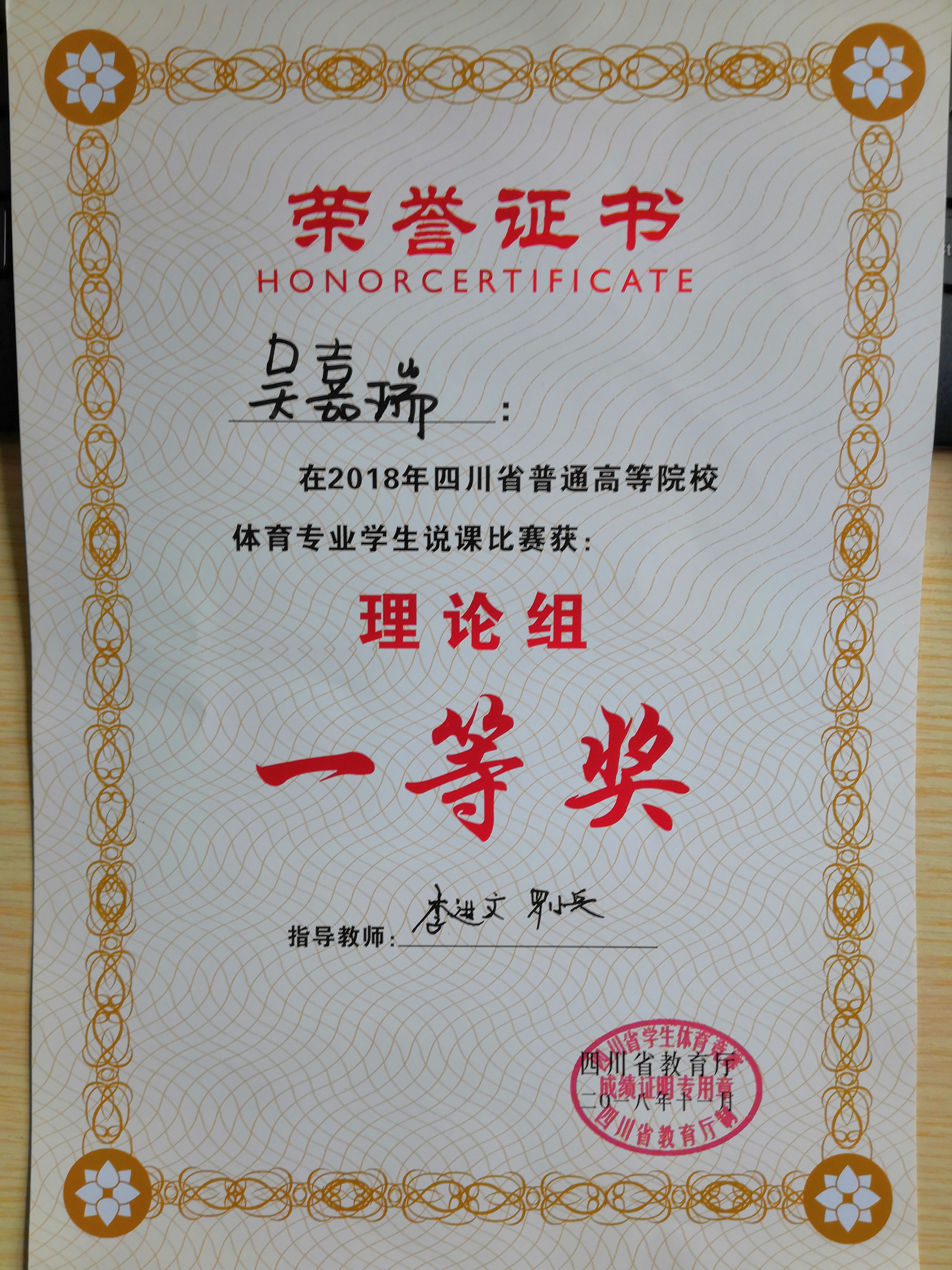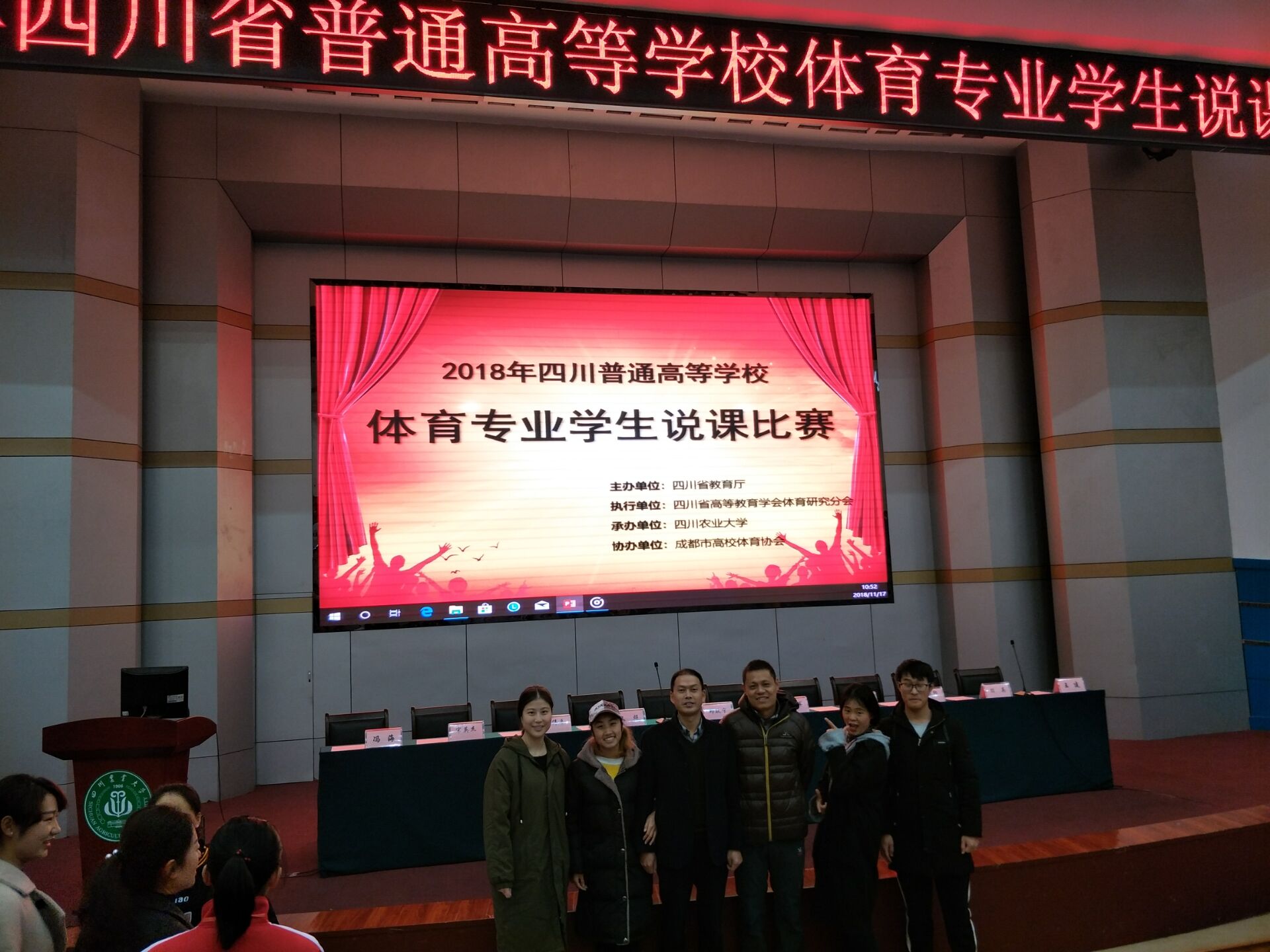 2018年11月15日至17日,由四川省教育厅主办的2018年四川省普通高等院校体育专业学生说课比赛在四川农业大学圆满落幕。经过两天的激烈竞争,taptap点点体育吴嘉瑞同学获得理论组一等奖,康利菊、曾子芮和陈念等三名同学获得三等奖,四川文理代表队荣获团体二等奖,成绩较以往有较大突破。陈碧述教授获得“优秀裁判员”称号。
