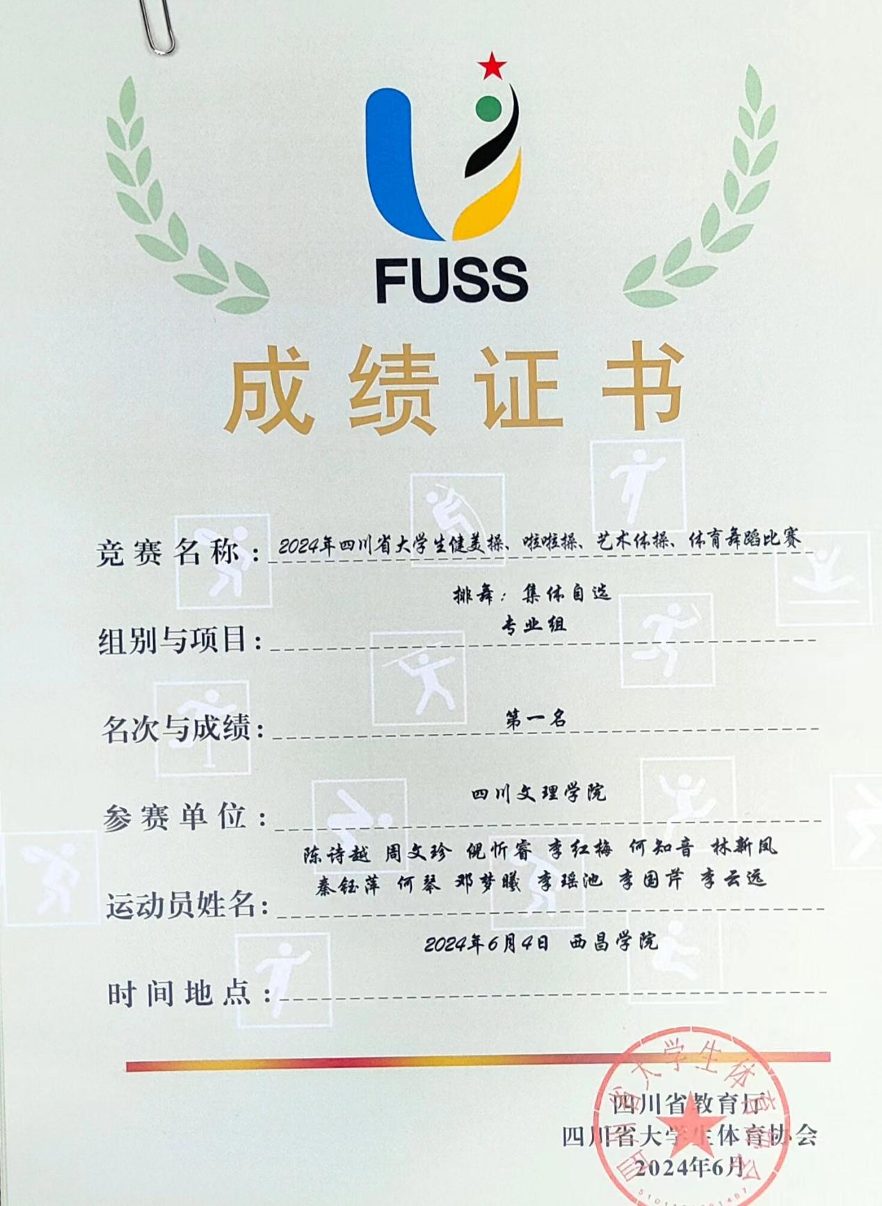 何琴,秦钰萍、倪忻睿、周文珍等12位同学,在与四川大学、成都师范学院、西昌学院、阿坝师范学院等学校同台竞技最终获得体育院校专业组,排舞自选曲目第一名。