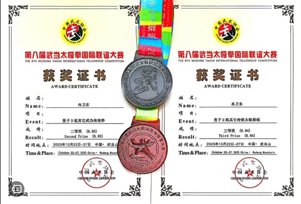 经过三个月的刻苦集训,taptap冉卫东老师凭借过硬实力,在强手如林的“一拳一械”个人项目中脱颖而出。其“太乙逍遥掌”招式精准、劲路饱满,于松柔舒缓中尽显太极的圆活与连绵之美,最终斩获二等奖(银牌);“武当太极扇”的表演则流畅圆活,开扇瞬间干净利落、劲发清脆,将武术的刚柔与艺术的美感完美融合,荣获三等奖(铜牌)。