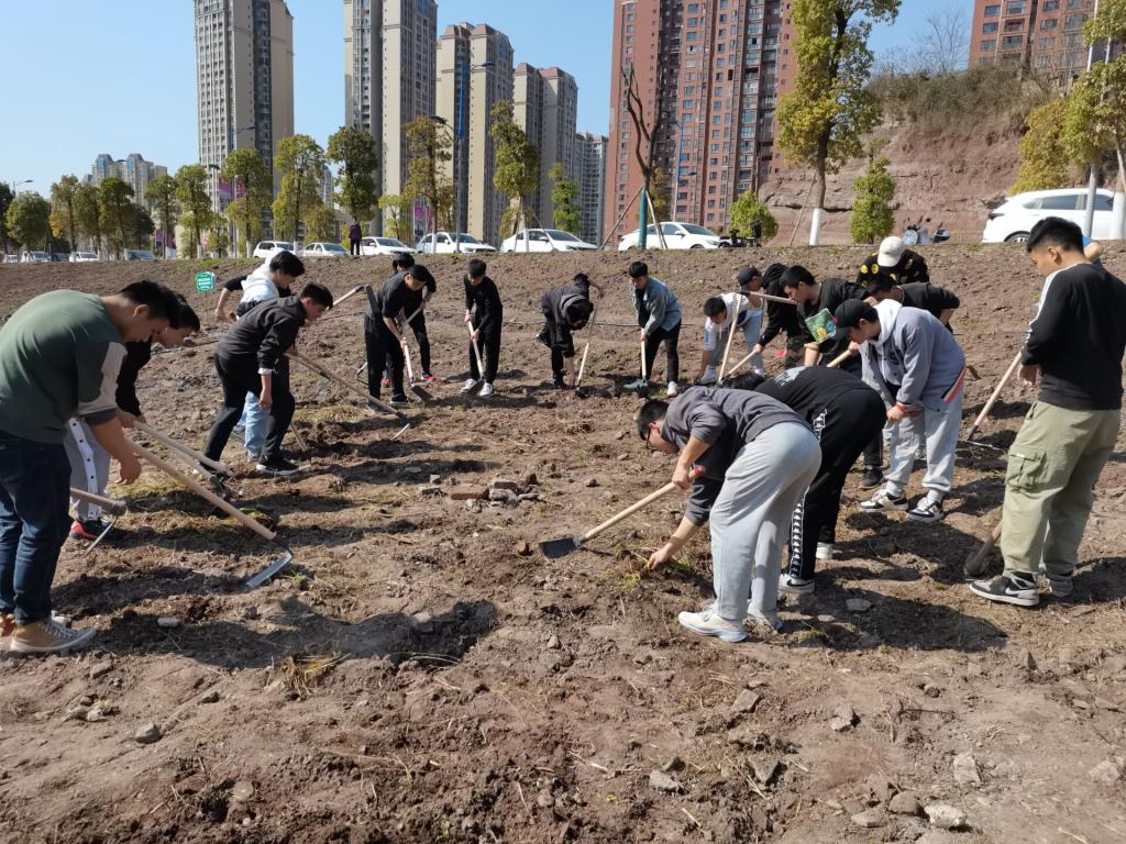 在带班辅导员的带领下同学们手拿锄头、铲子、纸箱、手套等工具有序来到学校劳动教育示范基地。大家分工明确,男同学挖地松土、清理石块,女同学除草、清理杂物。在老师的指导下,同学们很快投入了劳动。锄头的叮咚声、搬运大石块的加油声、除草折枝的窸窣声汇聚一堂,劳动场地热闹非凡。尽管汗水湿透了衣服,劳累隐现于眉宇,但这些丝毫不影响同学们看到脚下土地逐渐成形的喜悦心情。