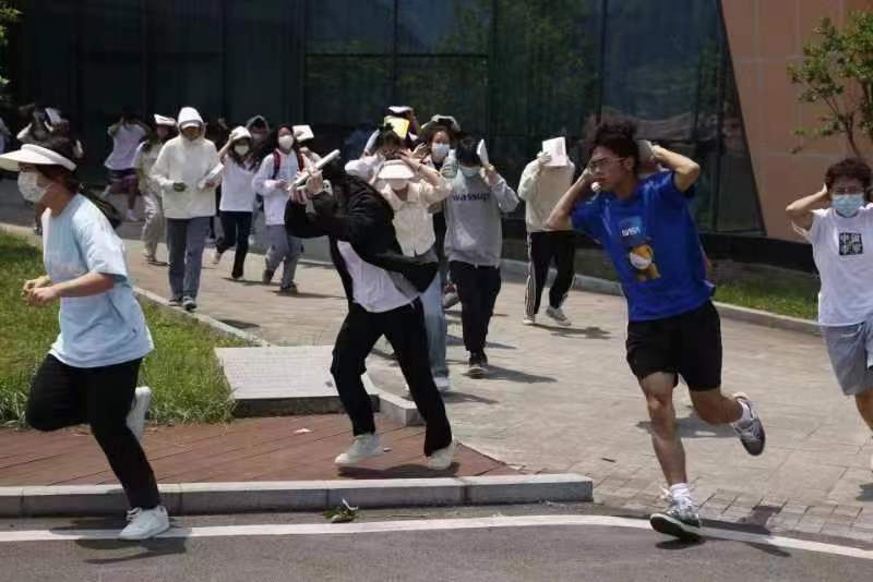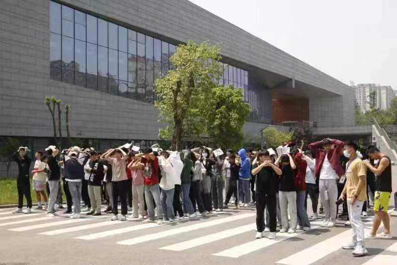 随着警报声响起,分布在体育馆各处的学生迅速从安全通道有序疏散,撤离到田径场指定区域,总耗时90秒。整个过程安全、严谨,完成预定计划。