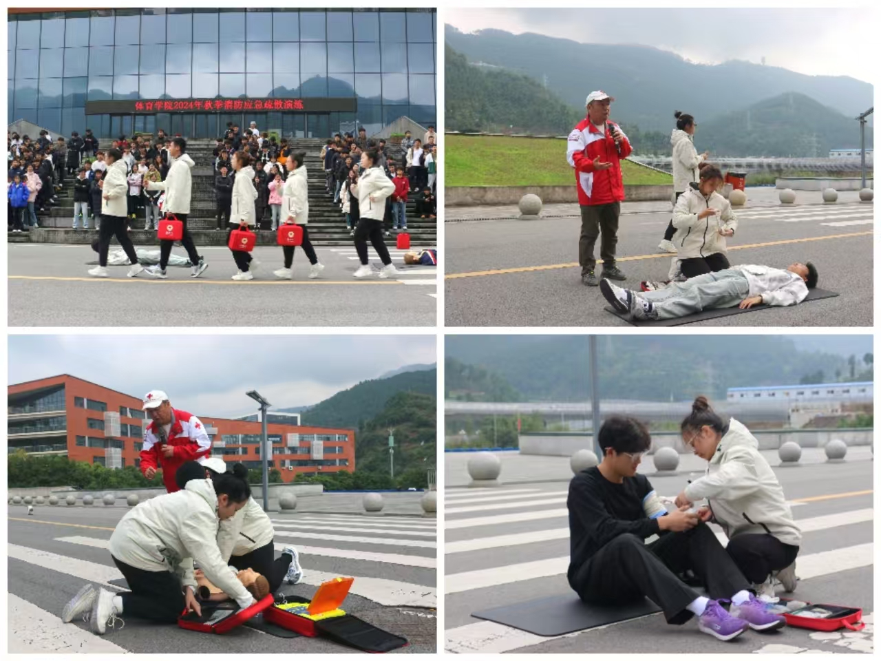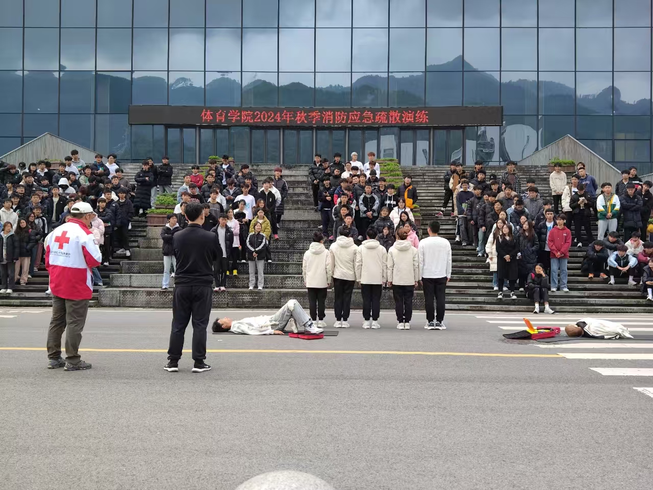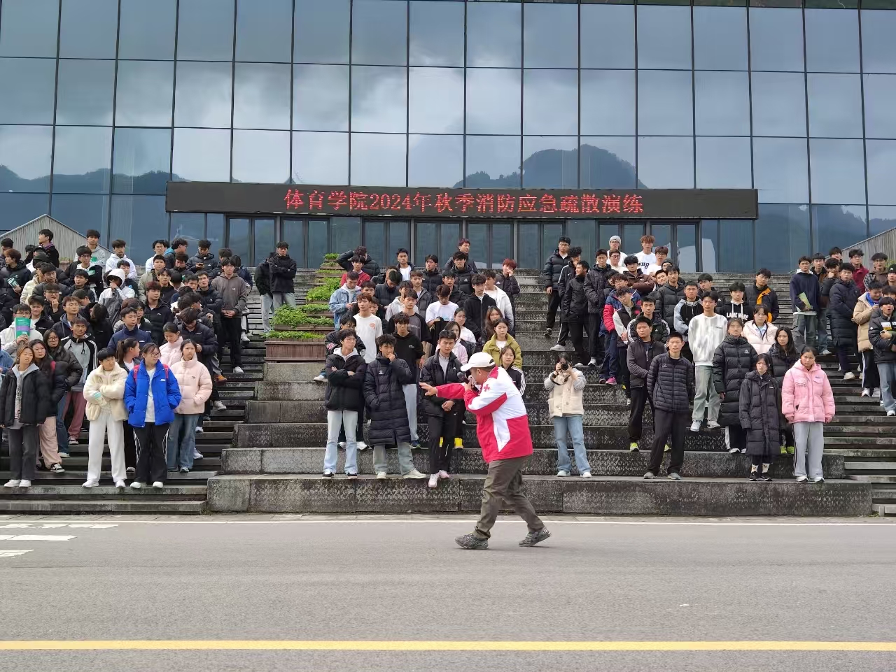 2024112212点整,taptap点点体育于体育馆开展了消防应急疏散演练。学院党委副书记靳浪、辅导员邓超、李波、专任教师宋京林、7 名红十字救护员及2024 级全体学生参与此次活动。