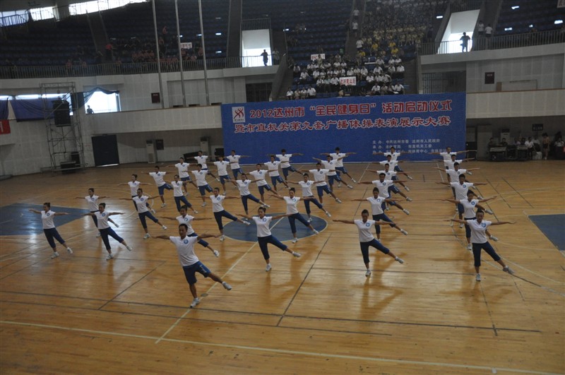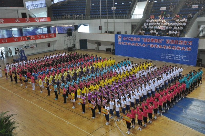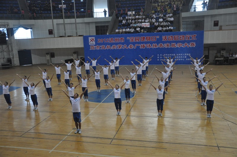 为了更好的营造全民健身活动氛围,提高广大市民的健身理念,努力建设幸福达州,8月8日上午,2012达州市“全民健身日”活动启动仪式暨市机关第九套广播体操表演展示大赛在市体育馆隆重举行,本次比赛由中共达州市委,达州市人民政府主办。四川文理学院党委书记李万斌教授受邀出席了活动的启动仪式并观看了比赛。体育系董立主任,系党总支佘涛副书记(主持全面工作),系党总支张皓副书记,系辅导员及学院的教师代表一行观看了全程比赛。